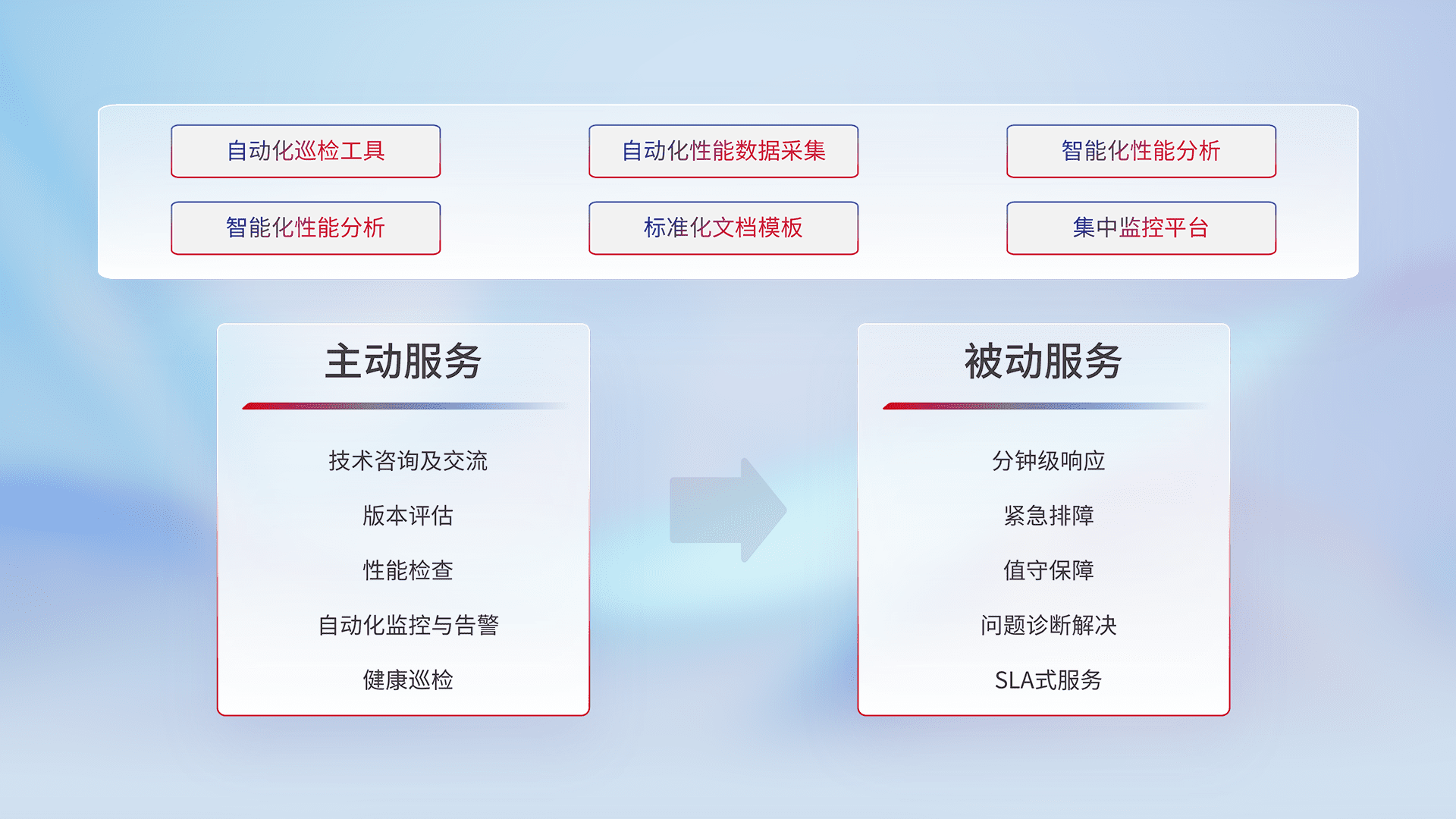 智能化工具和标准化文档,,,,保障服务质量,,提供主动服务(包含技术咨询、、、、版本评估、、性能检查、、、、自动化监控与告警、、健康巡检)和被动服务包含(分钟级响应、、、、紧急排障、、、值守保障、、、问题诊断解决、、、、SLA服务)。。。。