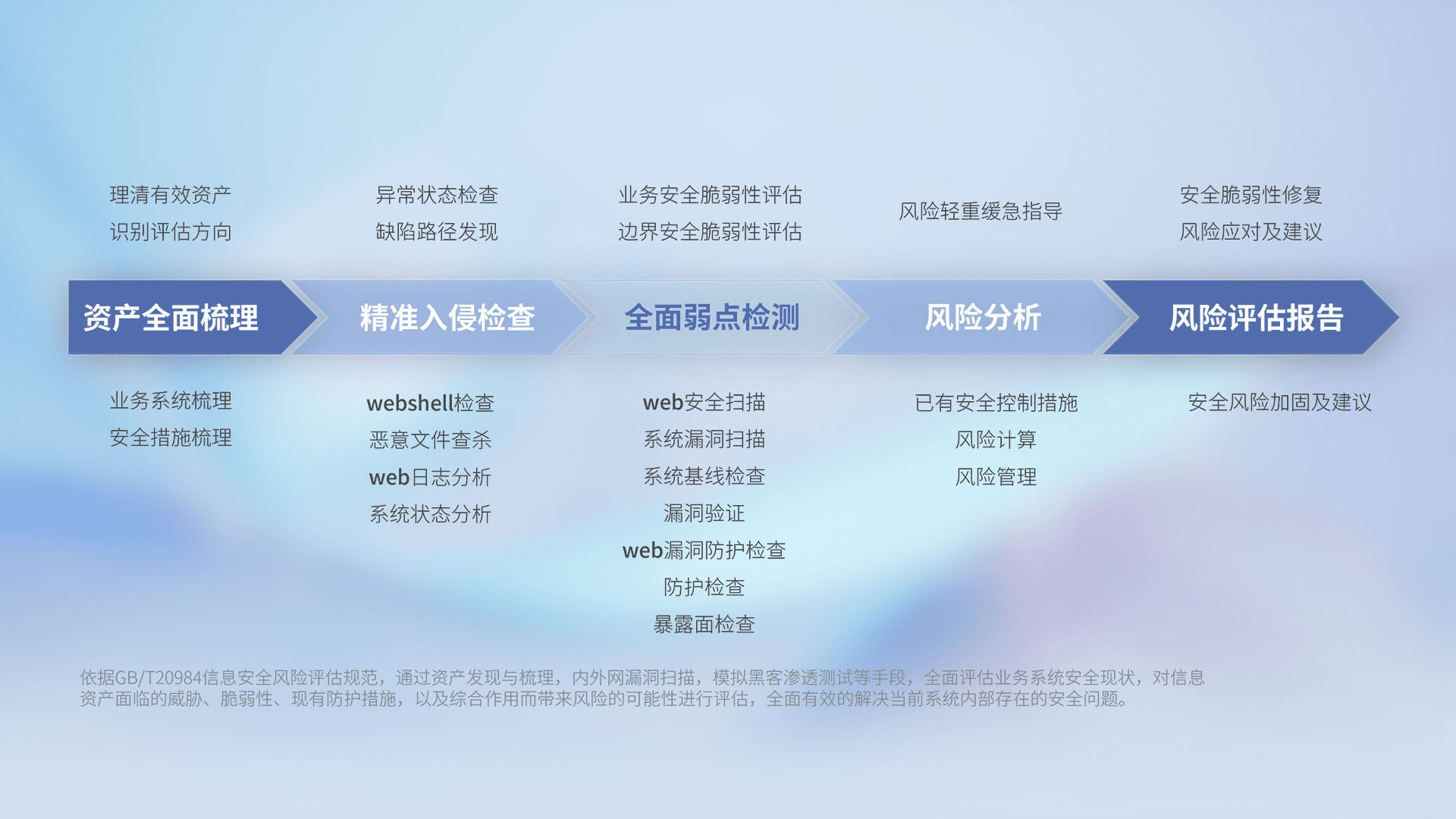 针对客户行业特性,,,,以专业的安全服务+多厂商联合解决方案提供专属的一站式安全管理服务,,帮助客户全面感知网络空间威胁,,,基于识别、、、、检测、、、、分析、、、防护、、监测、、、响应的服务理论模型,,,,从方案咨询、、、、集成交付、、评估验证、、、优化加固、、、、运维运营,,,,致力于为客户提供完整的闭环管理式安全服务。。以实战经验为客户打造高抵御风险的安全体系,,,帮助客户发现威胁、、、对抗威胁、、处置威胁,,,不断积累安全对抗能力,,,,持续保障数字化安全。。