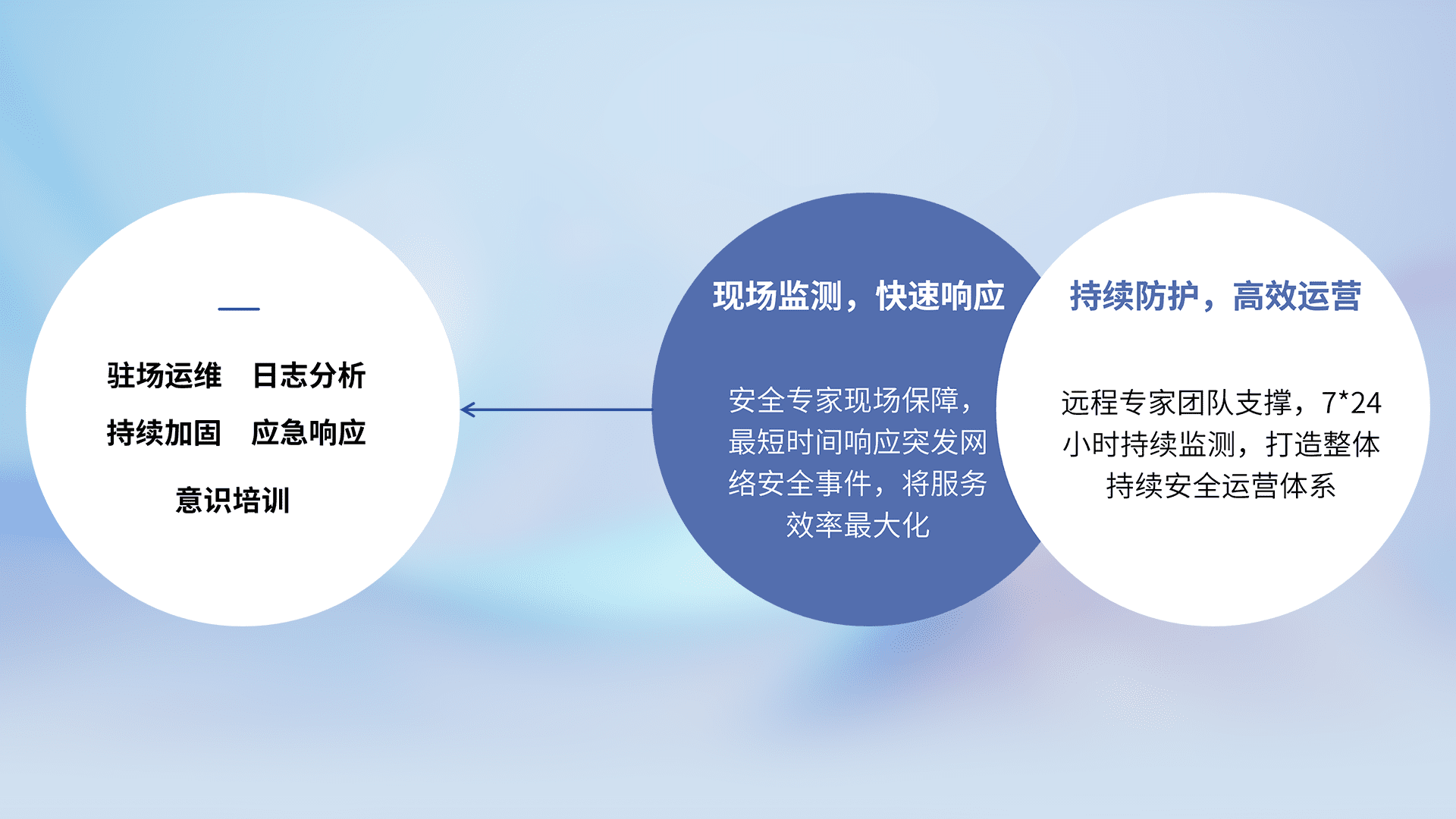 针对客户行业特性,,,,提供专属的一站式安全管理服务,,帮助客户全面感知网络空间威胁,,,通过安全专家的线上、、、、线下防护支持,,实现风险闭环,,,,将安全保障常态化,,为客户打造常态化安全运维运营服务。。。